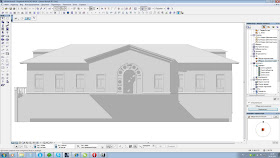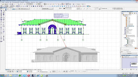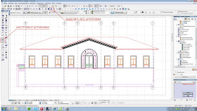 Первый этап мы выполнили. Теперь жмем Ctrl+F8. Изображение нашего фасада автоматически открылось в макете, но так как оно нам здесь пока не нужно, просто копируем его и, вернувшись на этаж, вставляем его в поле этажа. И так, наша подложка с тенями готова, осталось нанести контуры. Для этого нам понадобится инструмент РАЗРЕЗ или ФАСАД. Я воспользуюсь разрезом, установив его вдоль моего фасада.
