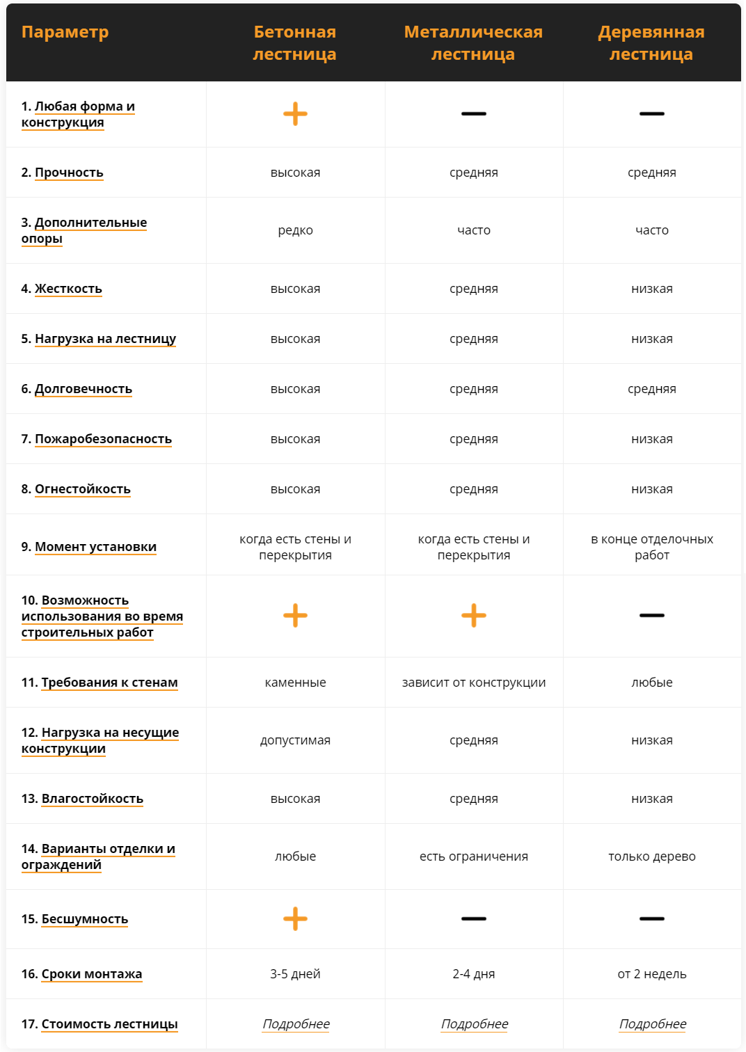 Таблица сравнения лестниц из бетона, металла и дерева