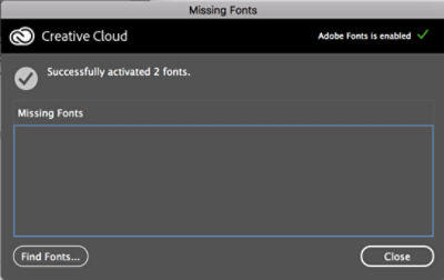 При возникновении проблем с добавлением новых шрифтов отобразится сообщение об ошибке в диалоговом окне «Отсутствующие шрифты» и в Creative Cloud для настольных ПК.